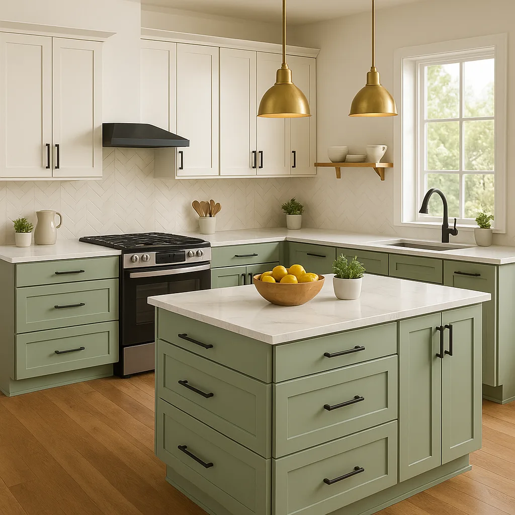 This blog explores the stunning transitional kitchen design featuring sage green lower cabinetry paired with creamy white uppers — a combination that offers visual depth, warmth, and timeless appeal.