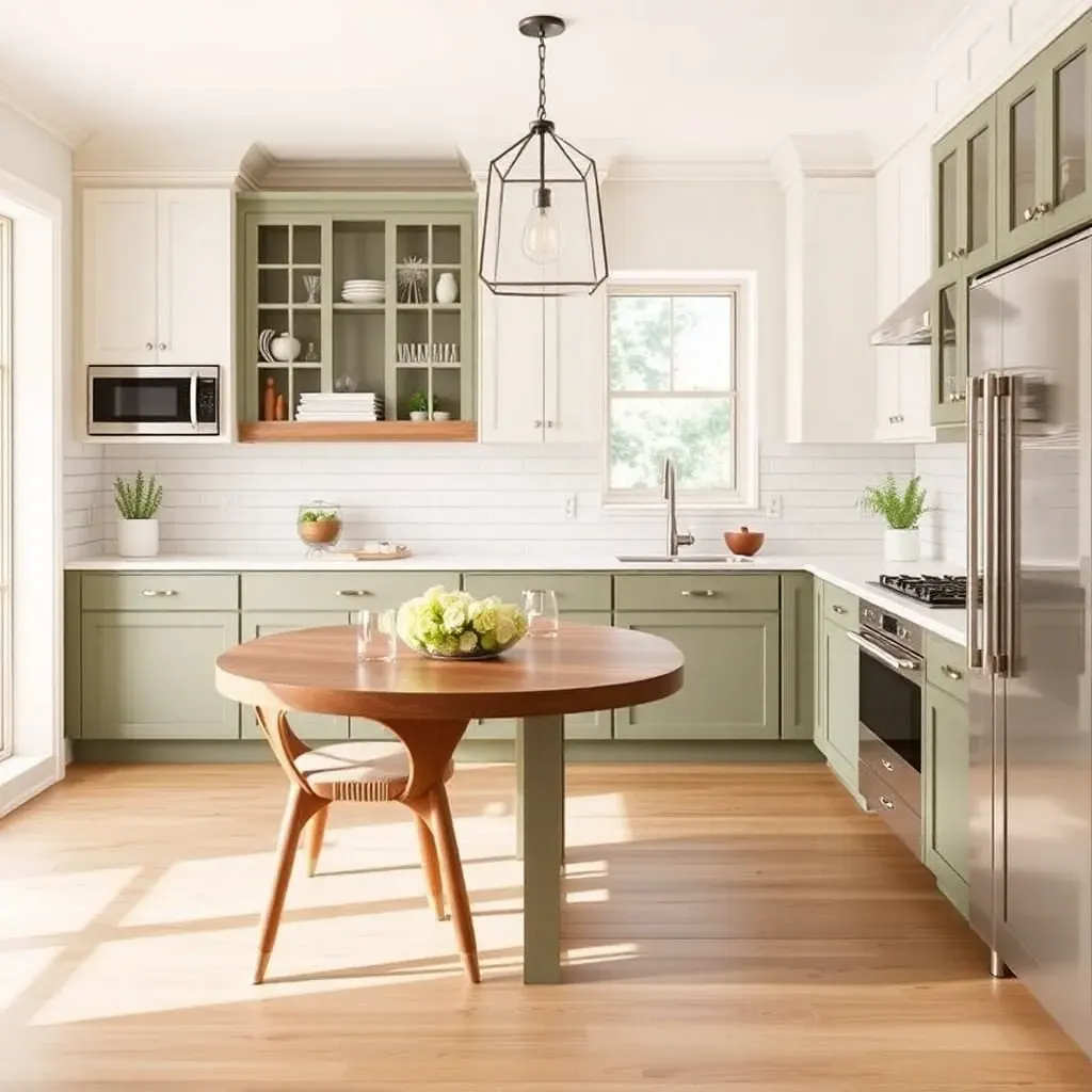 Our featured kitchen brings this idea to life by blending earthy sage cabinetry with soft whites and warm wood tones, creating a serene and inviting atmosphere.