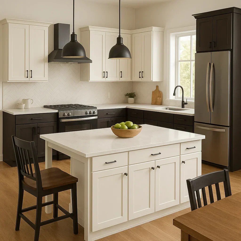 The kitchen in the image showcases a harmonious blend of cabinetry styles. The upper cabinets, finished in a bright white, create a sense of spaciousness and light. Their sleek, handle-less design contributes to the modern aesthetic. The lower cabinets, in a contrasting dark tone, ground the space and add a touch of sophistication. This two-toned approach is a popular trend in kitchen design, offering visual interest and preventing the space from feeling too monotonous.